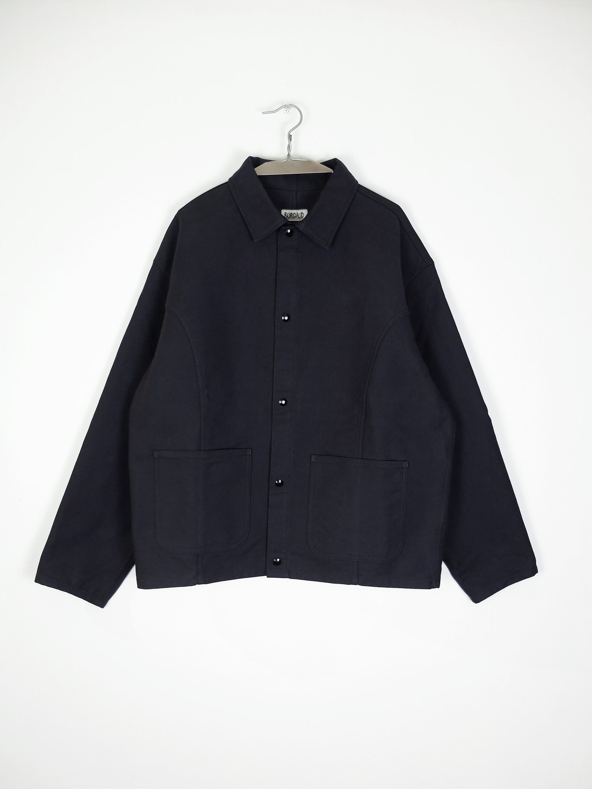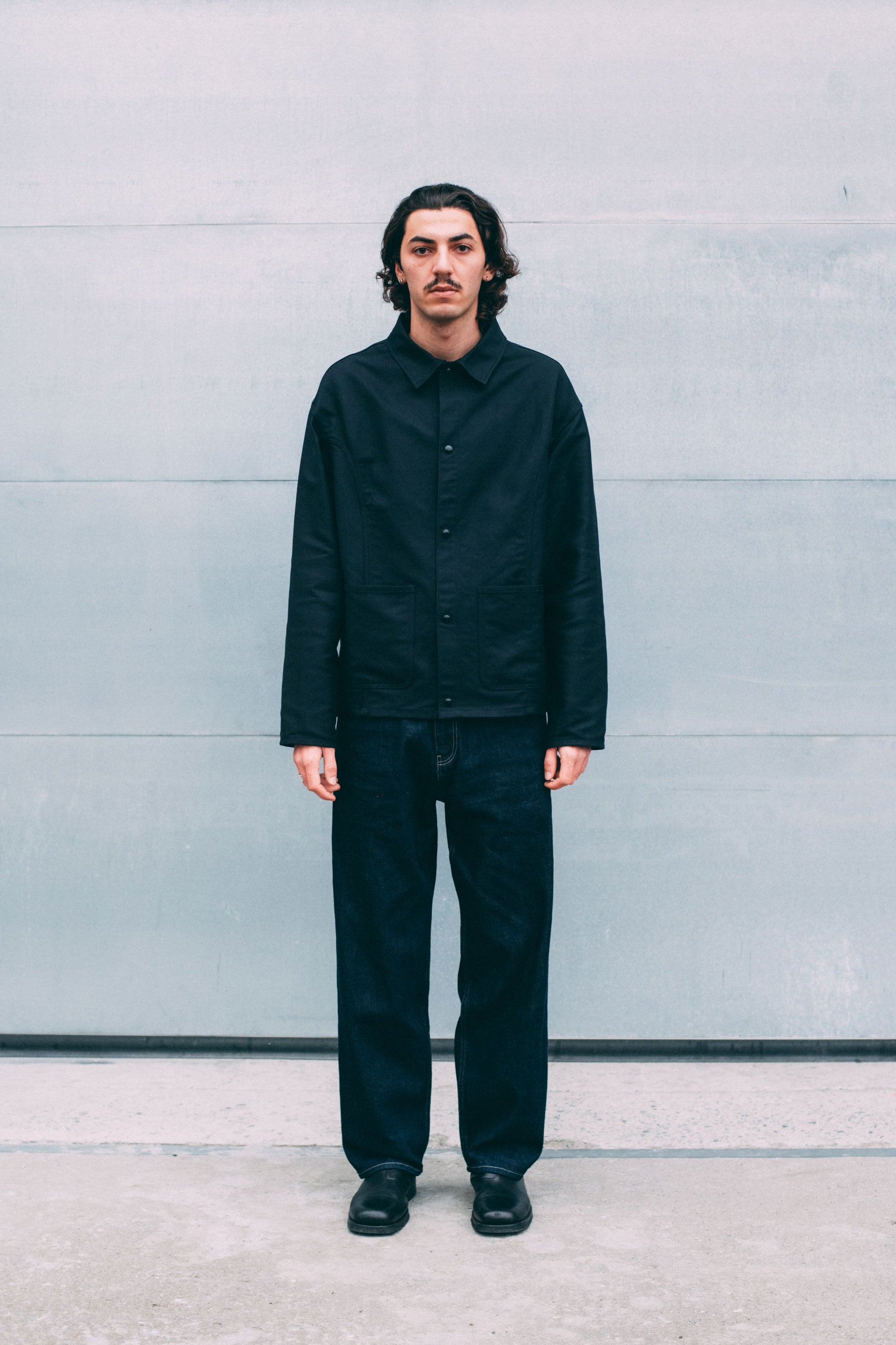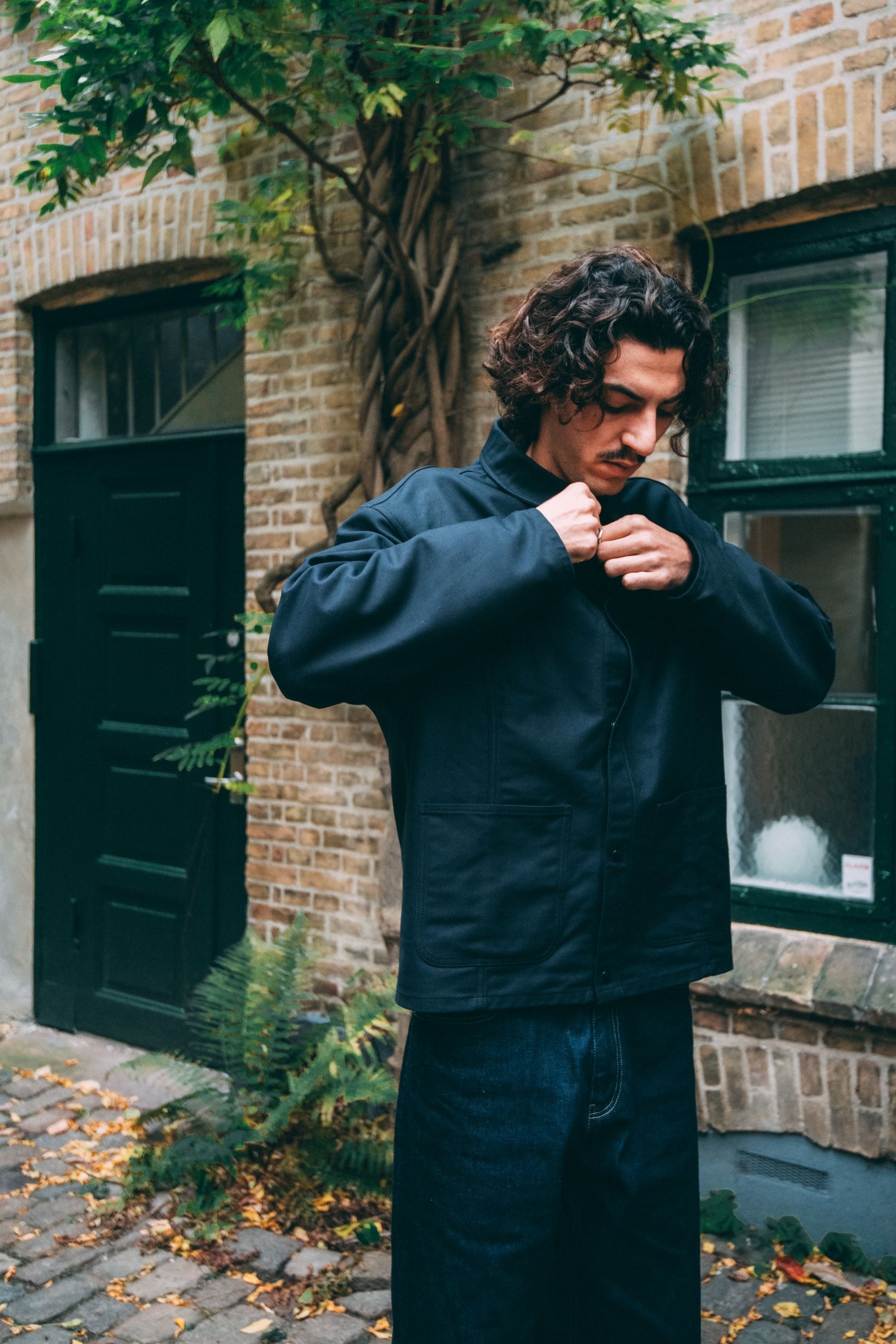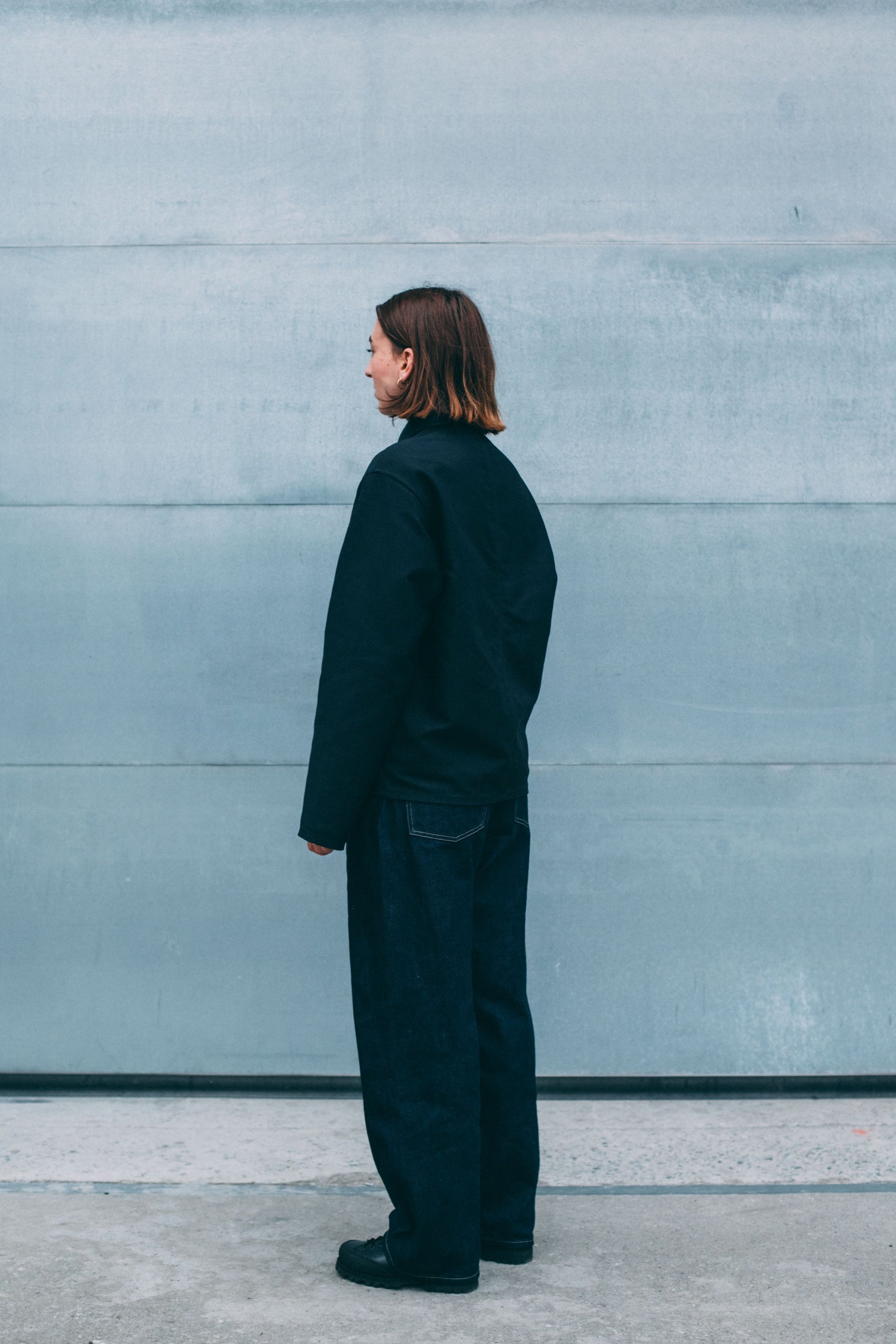 Cette veste est fabriquée à la main en France dans un sergé de coton lourd waterproof bleu très foncé. La veste a une coupe décontractée, légèrement raccourcie et resserrée au bas. Elle possède deux grandes poches rondes et des boutons pressions noirs.