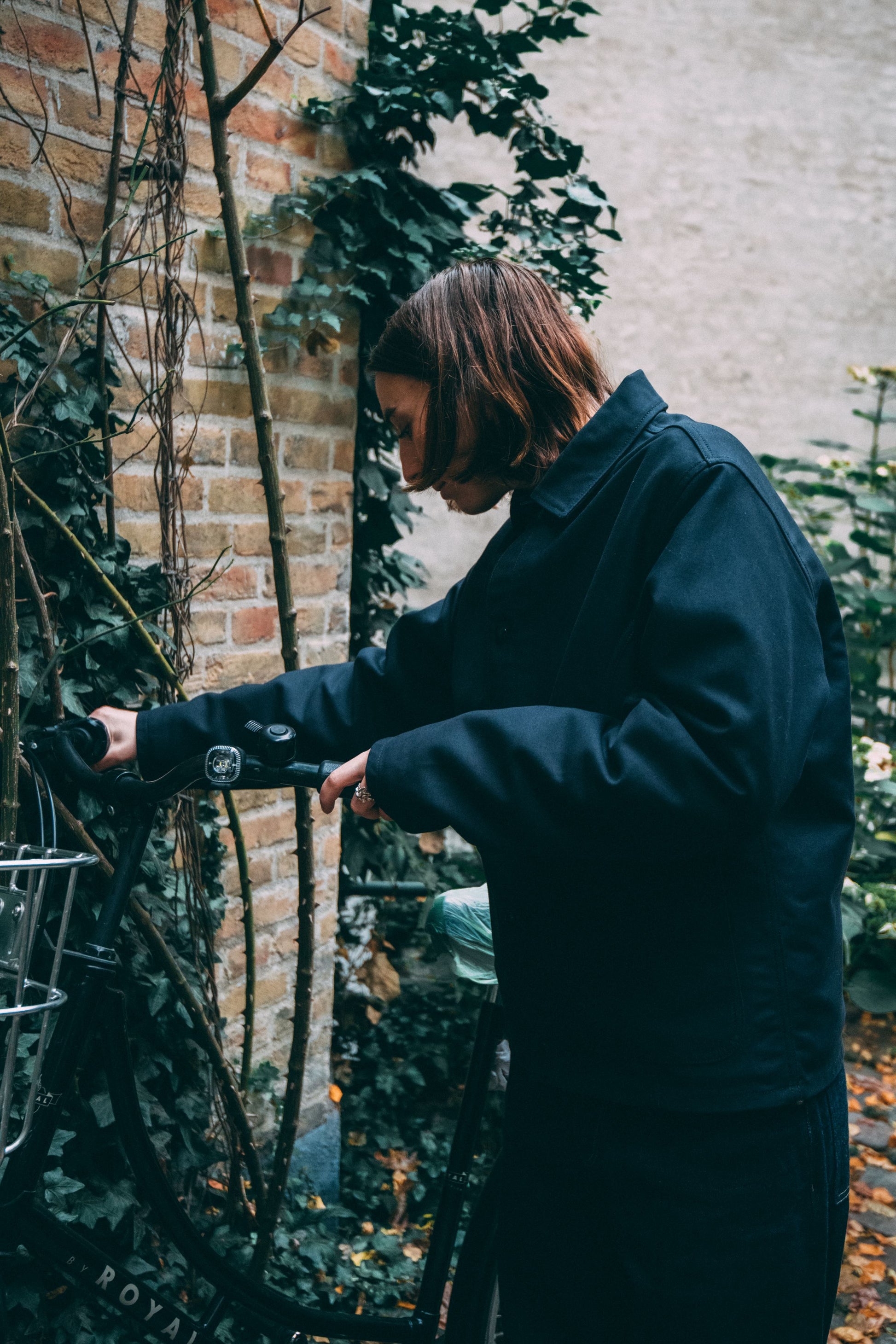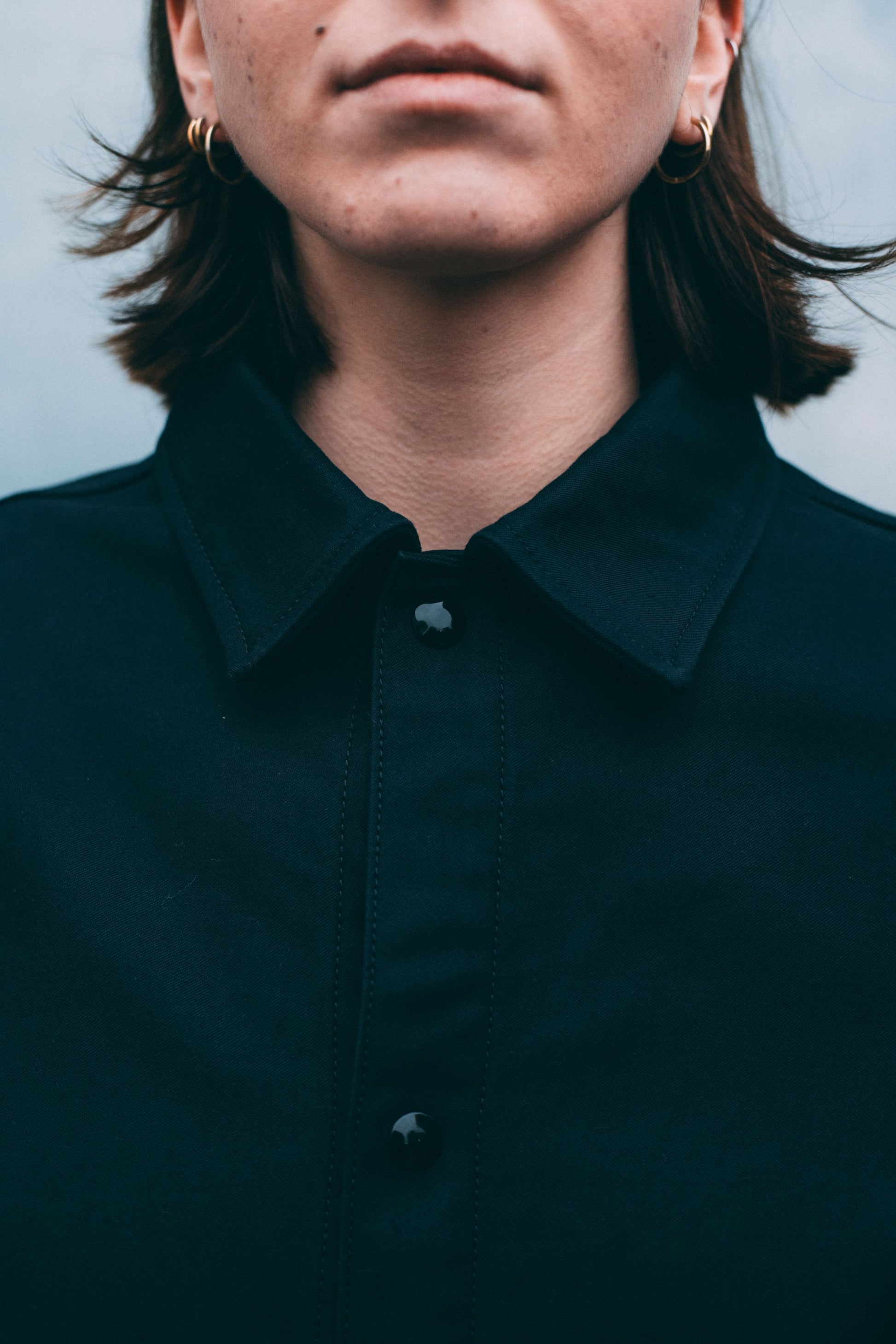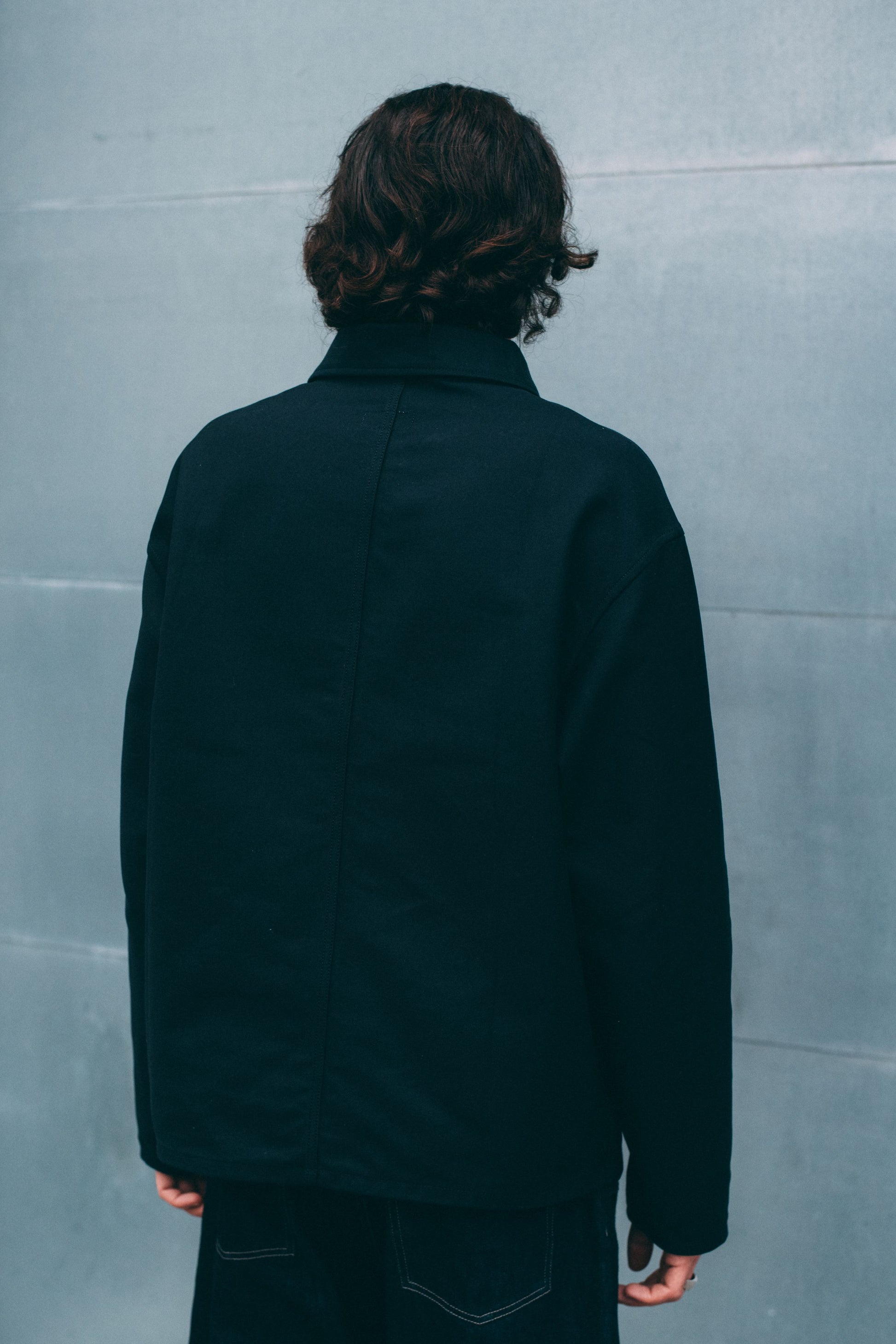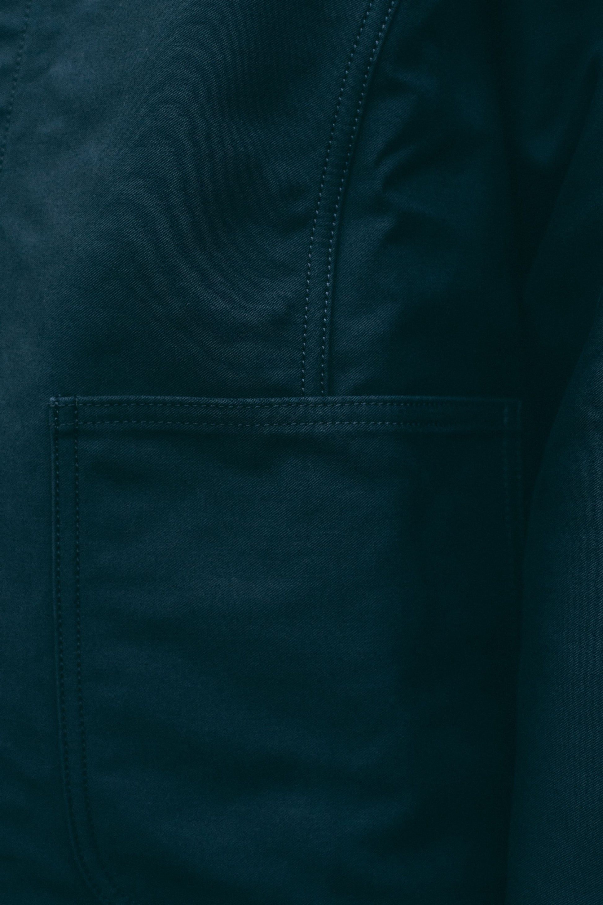 Cette veste est fabriquée à la main en France dans un sergé de coton lourd waterproof bleu très foncé. La veste a une coupe décontractée, légèrement raccourcie et resserrée au bas. Elle possède deux grandes poches rondes et des boutons pressions noirs.