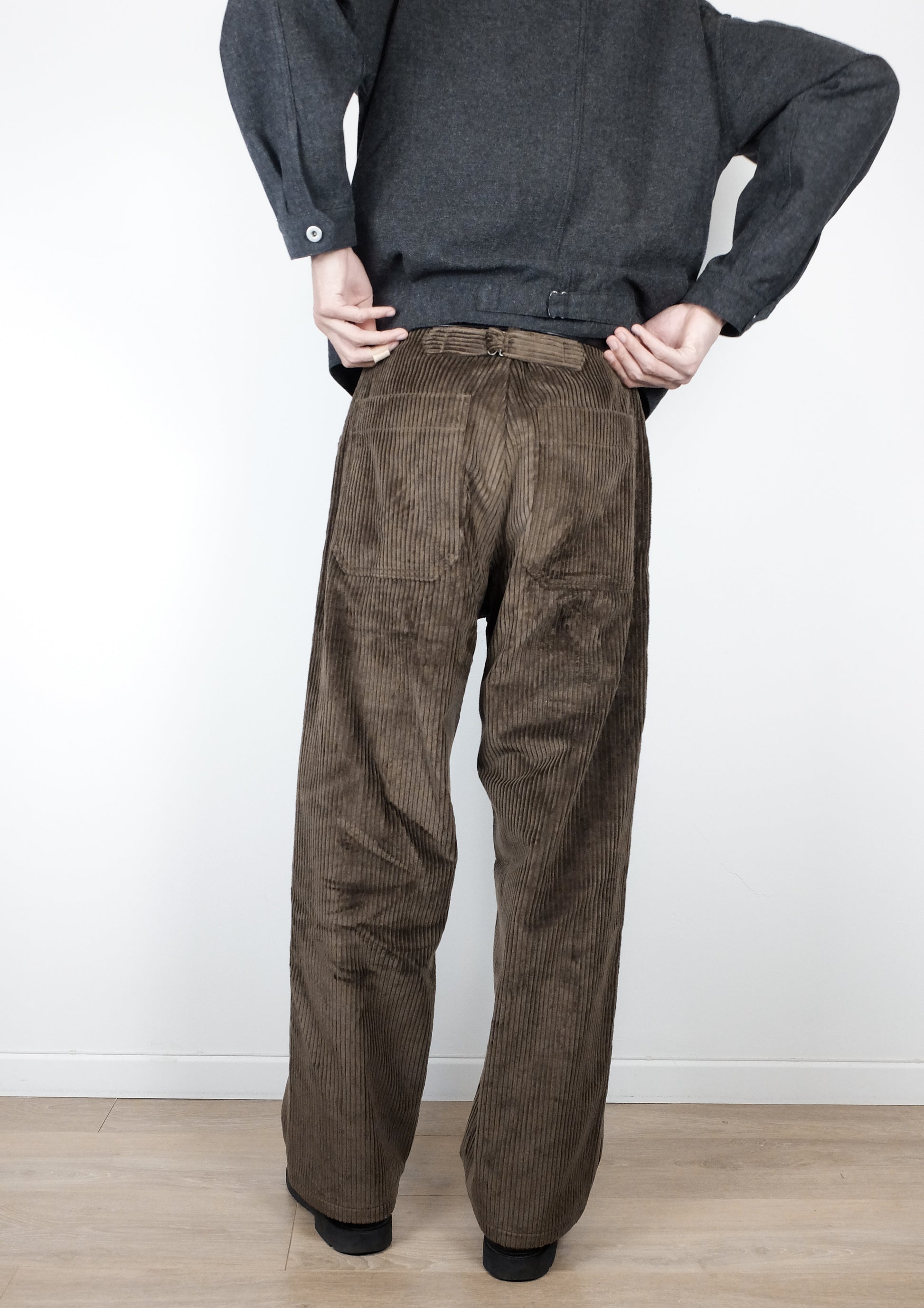 This new pant is crafted from a 380 gsm deadstock Italian corduroy fabric, and fully lined. New cut wider than jeans with a high waist, and finished with a buckle back made with vintage reproduction buckle and a snap button.
