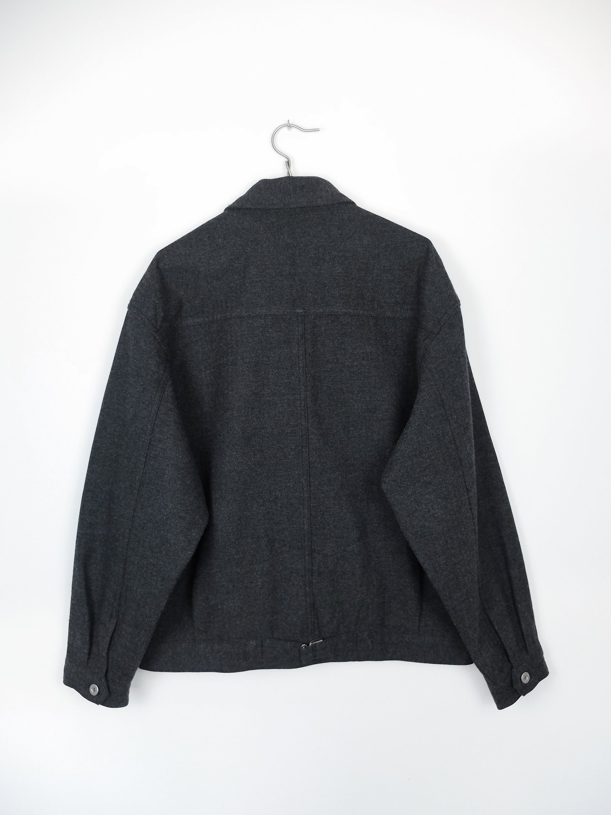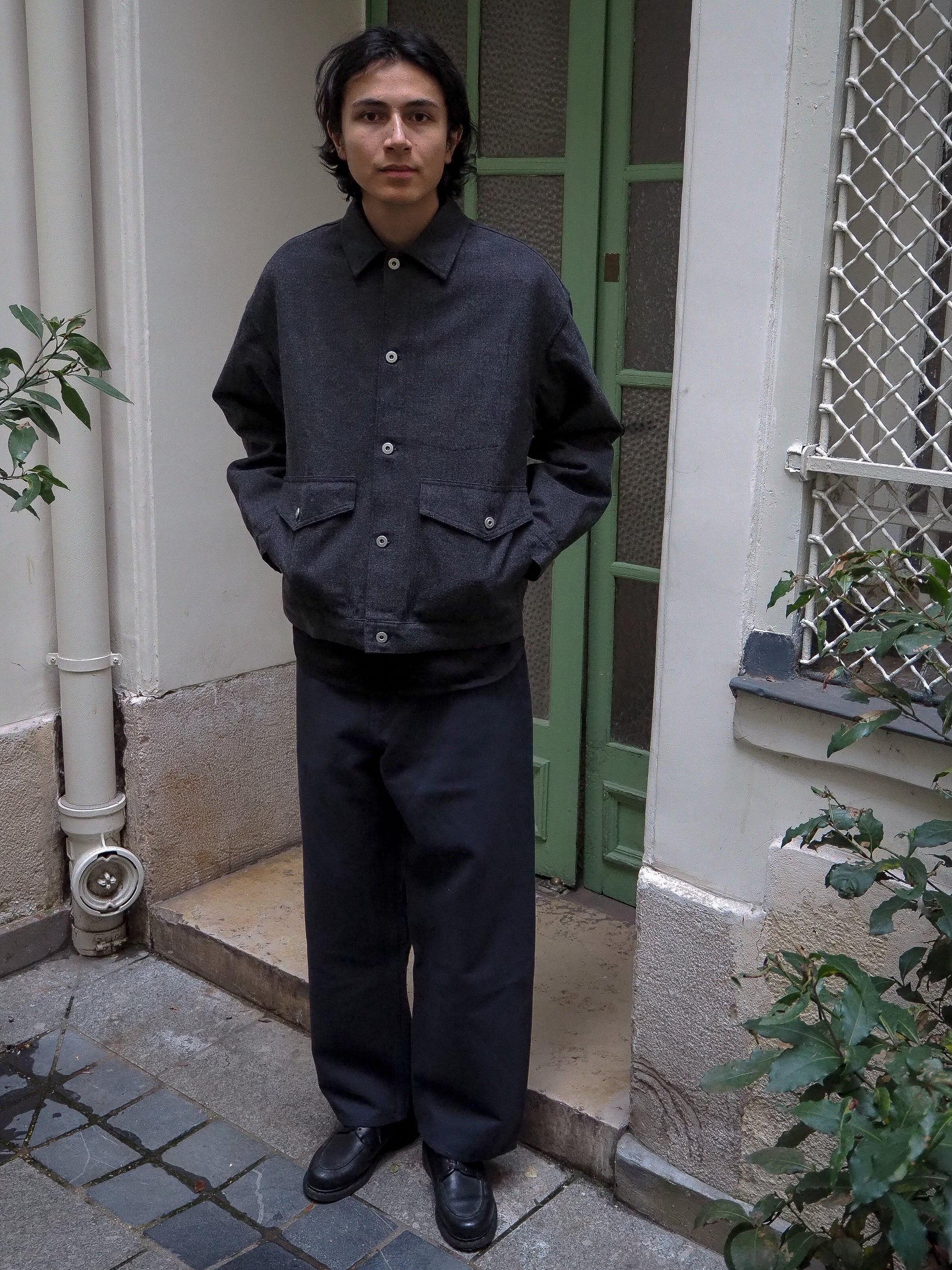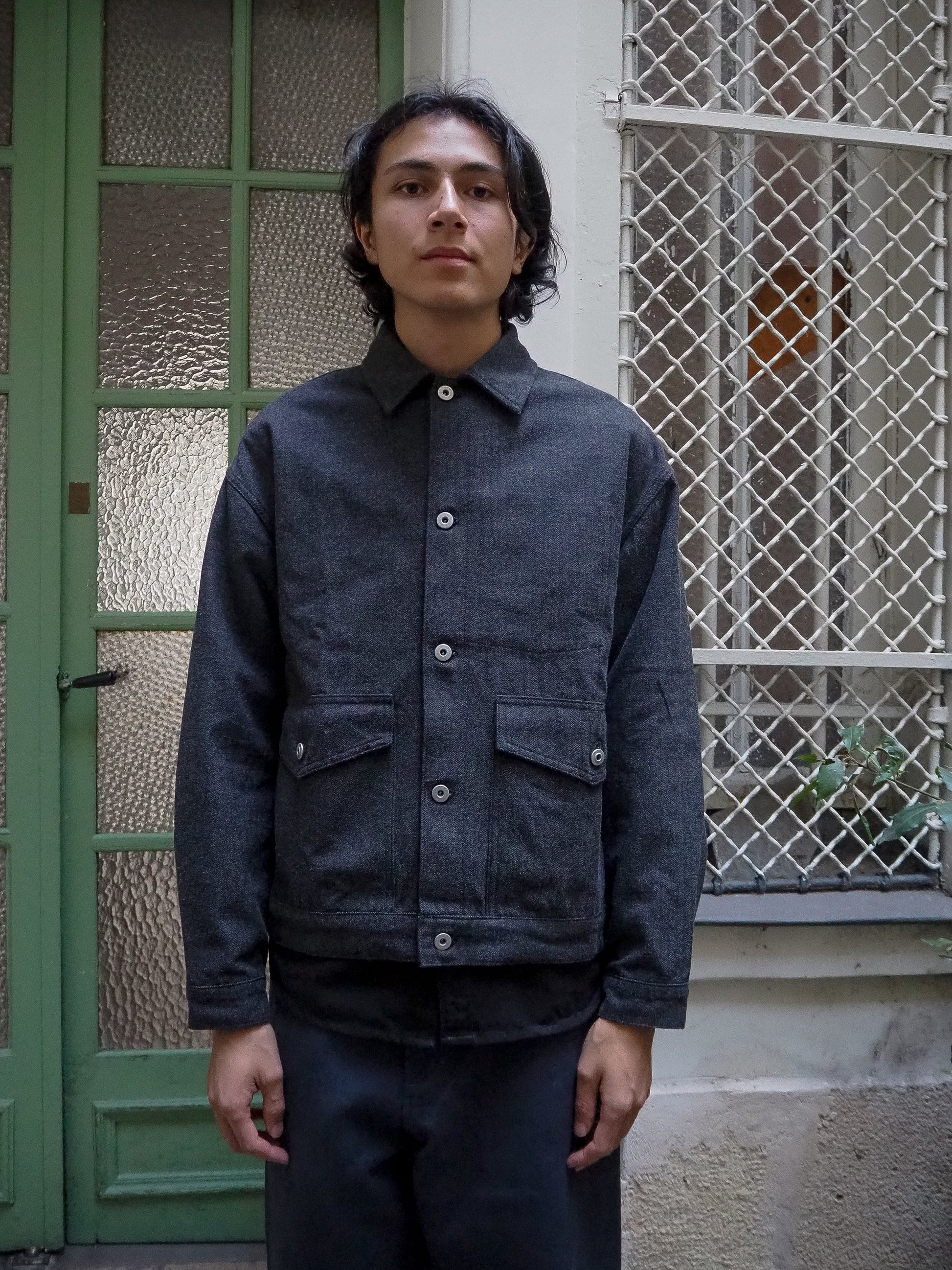 The Mi-Laine jacket 2 is a 1 of 1 item. Crafted from a cotton/wool herringbone woven in France by Manufacture Métis. Made in a relaxed, and cropped shape, this jacket takes the design of the Denim jacket with functional details like two large flap pockets with hidden side entry, a discreet inner pocket, and a classic buckle-back with a vintage-style buckle. Finishing touches include donut buttons, and selvedge details at the waistband, and placket.
